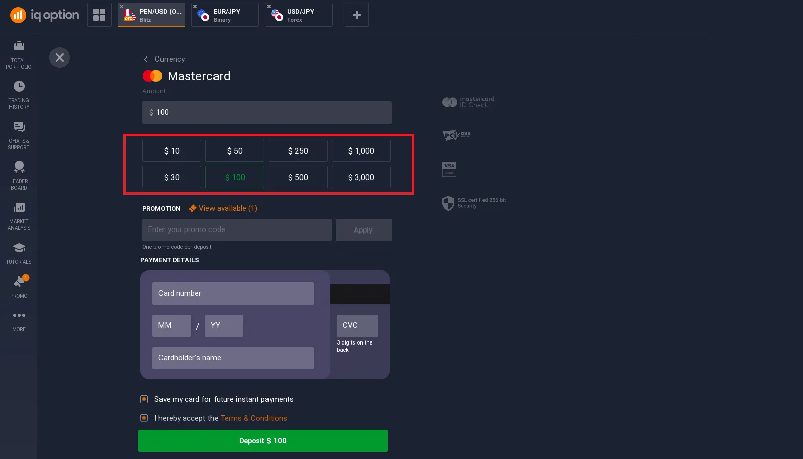For Nigeria, the supported currencies on the IQ Option platform is the Nigerian Naira (NGN), USD, EUR. The minimum deposit or payment is 8,000 NGN, the minimum withdrawal is 1,600 NGN, and the minimum investment is 800 NGN. The maximum investment allowed is 8,500,000 NGN.